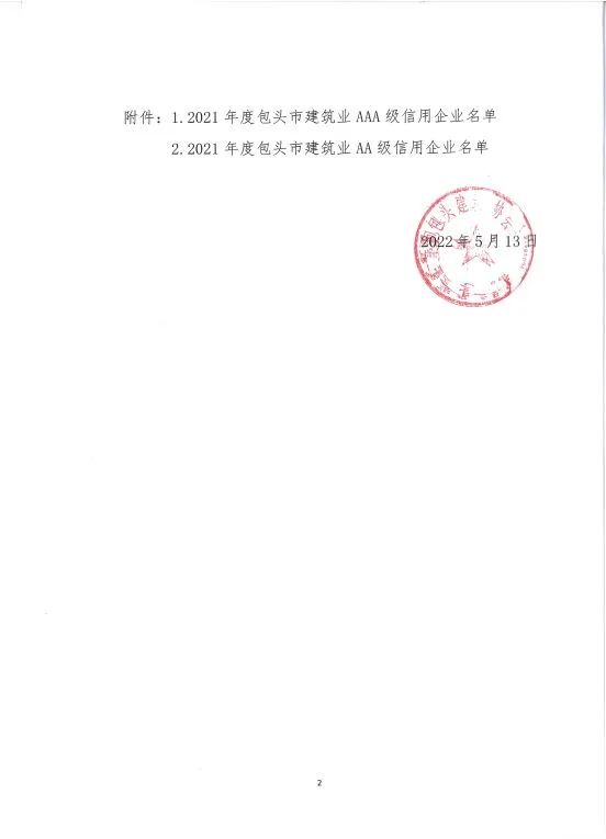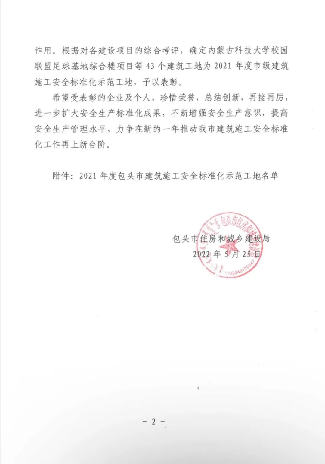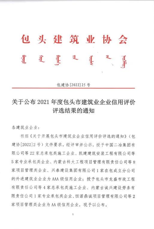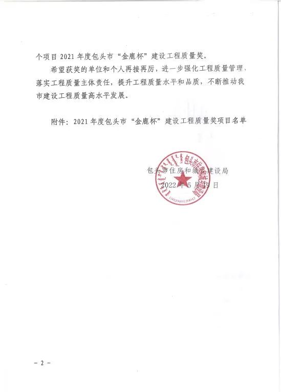 2021年度包头市建设工程质量管理优秀企业、包头市建设工程安全管理优秀企业