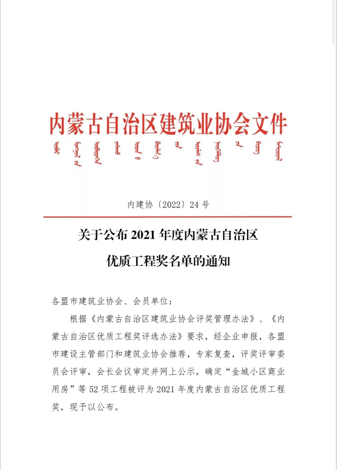2021年度内蒙古自治区优质工程奖(3个项目)