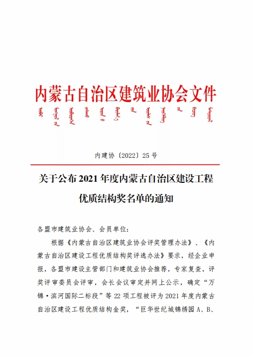 2021年度内蒙古自治区建设工程优质结构奖(银奖)(1个项目)
